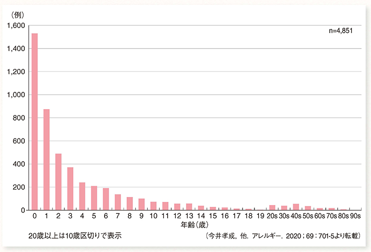 食物アレルギーのタイプとしては頻度が高く、どの年齢でも発症する可能性がありますが、表2で示されるように、乳幼児早期での発症頻度が最も高いです。また、新規発祥の原因食物は表3で示されるように、年齢によって頻度が異なります。