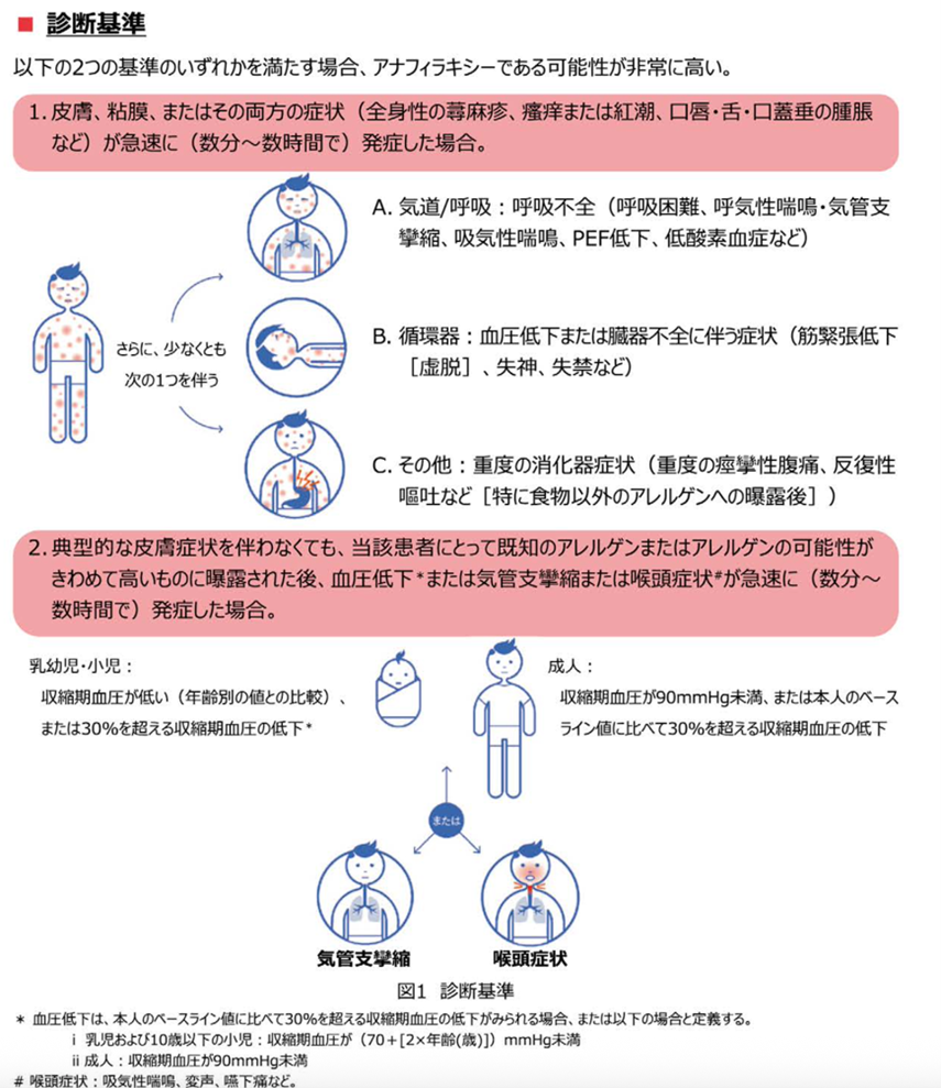 アナフィラキシーの原因には食物、薬剤、昆虫刺傷などがあります。食物アレルギーの場合、多くは食後2時間以内にアレルギー症状が出現しますが、診断基準は図3に示される2つの基準のいずれかを満たす場合です。