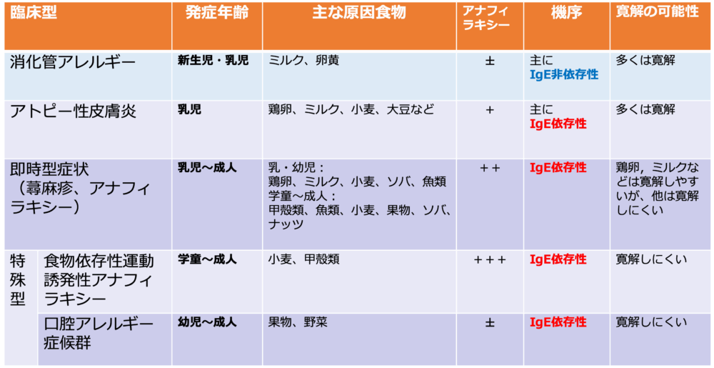 食物アレルギーにはいくつか種類があります。(表1)発症年齢や食物摂取後に症状が出るまでの時間などで、お子さんの食物アレルギーがどのタイプのか見当をつけることができます。